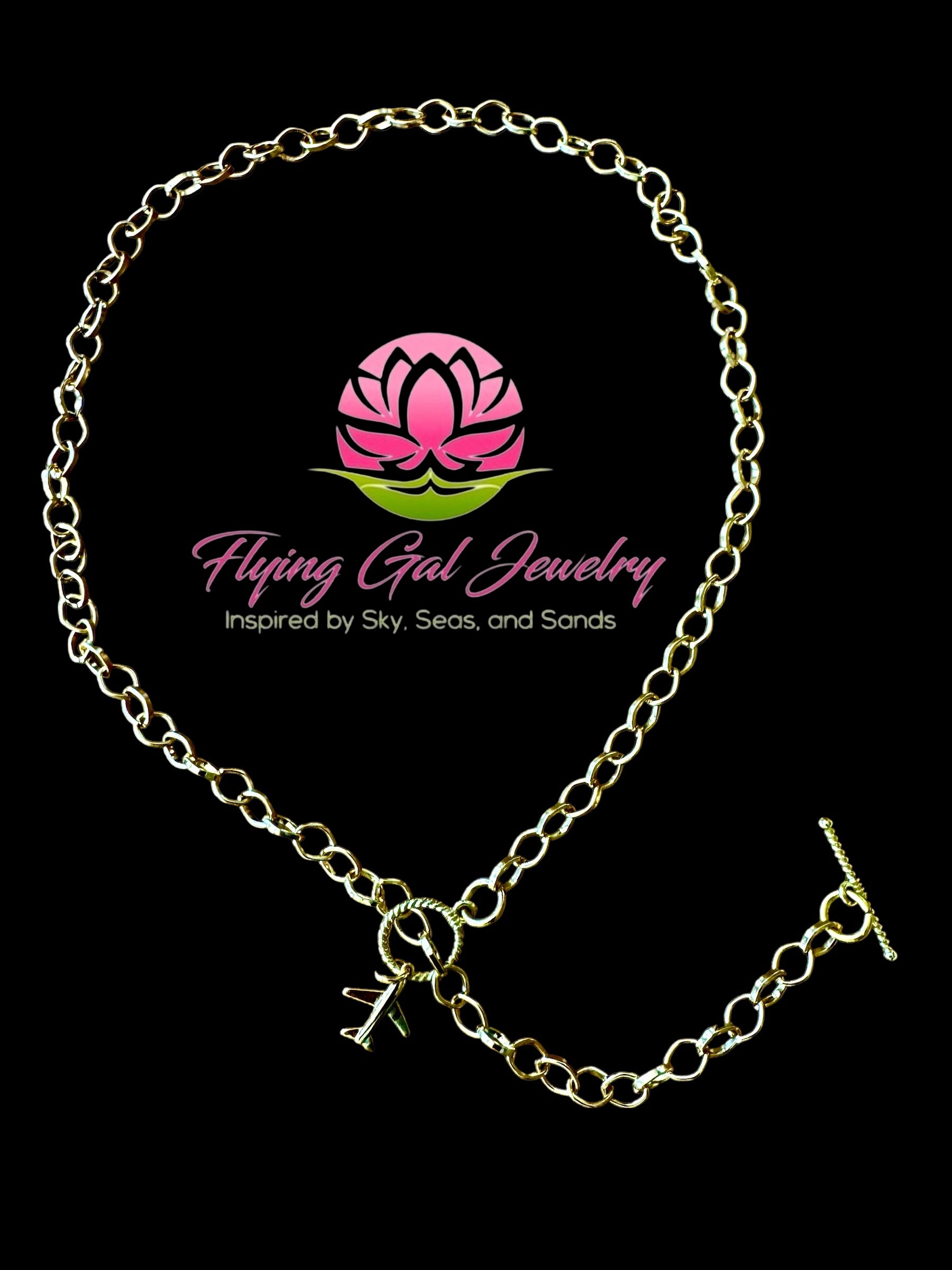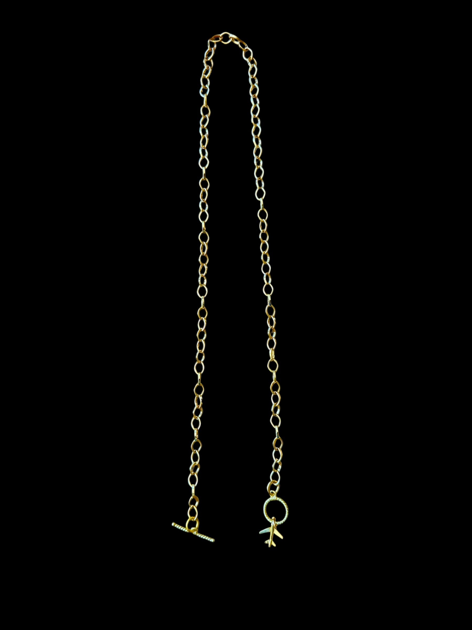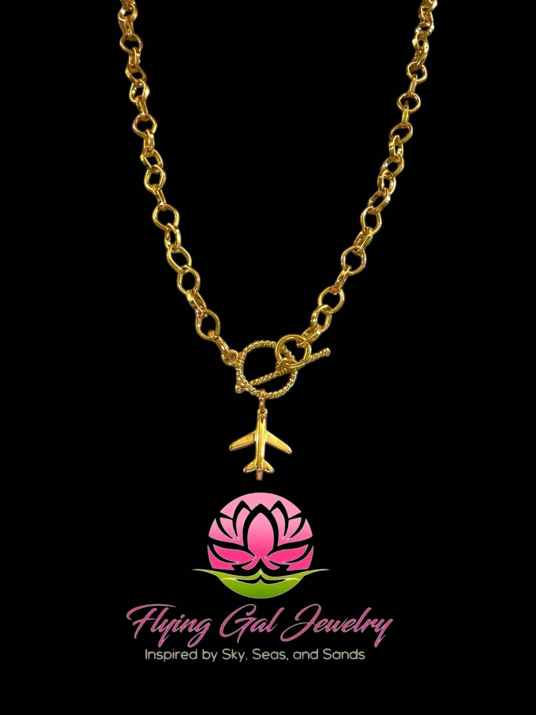 Celebrate your love of flight with this elegant 24” gold plated toggle necklace featuring a delicate gold plated airplane charm. The bold yet classic chain and front toggle clasp create a modern statement while keeping the look effortlessly wearable.