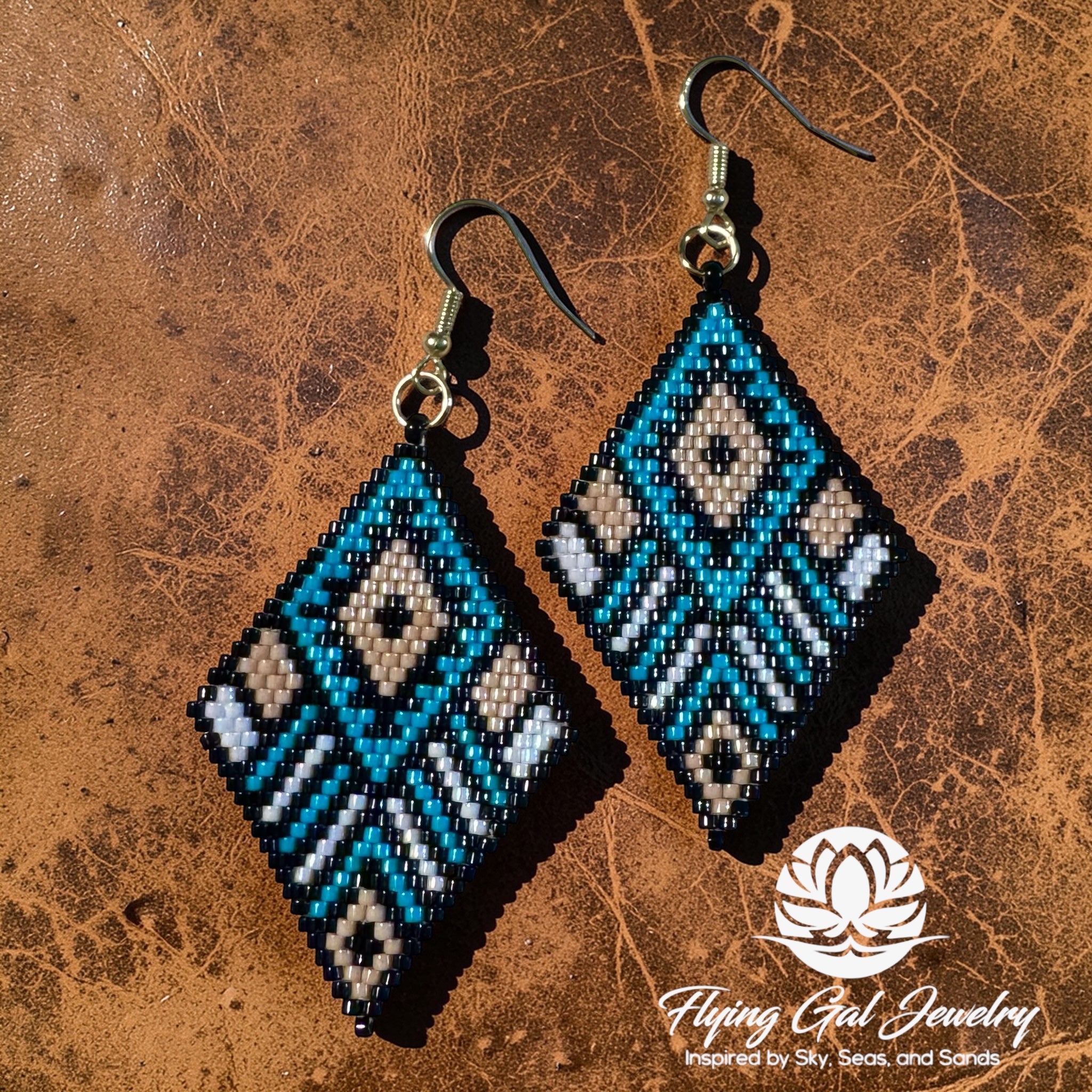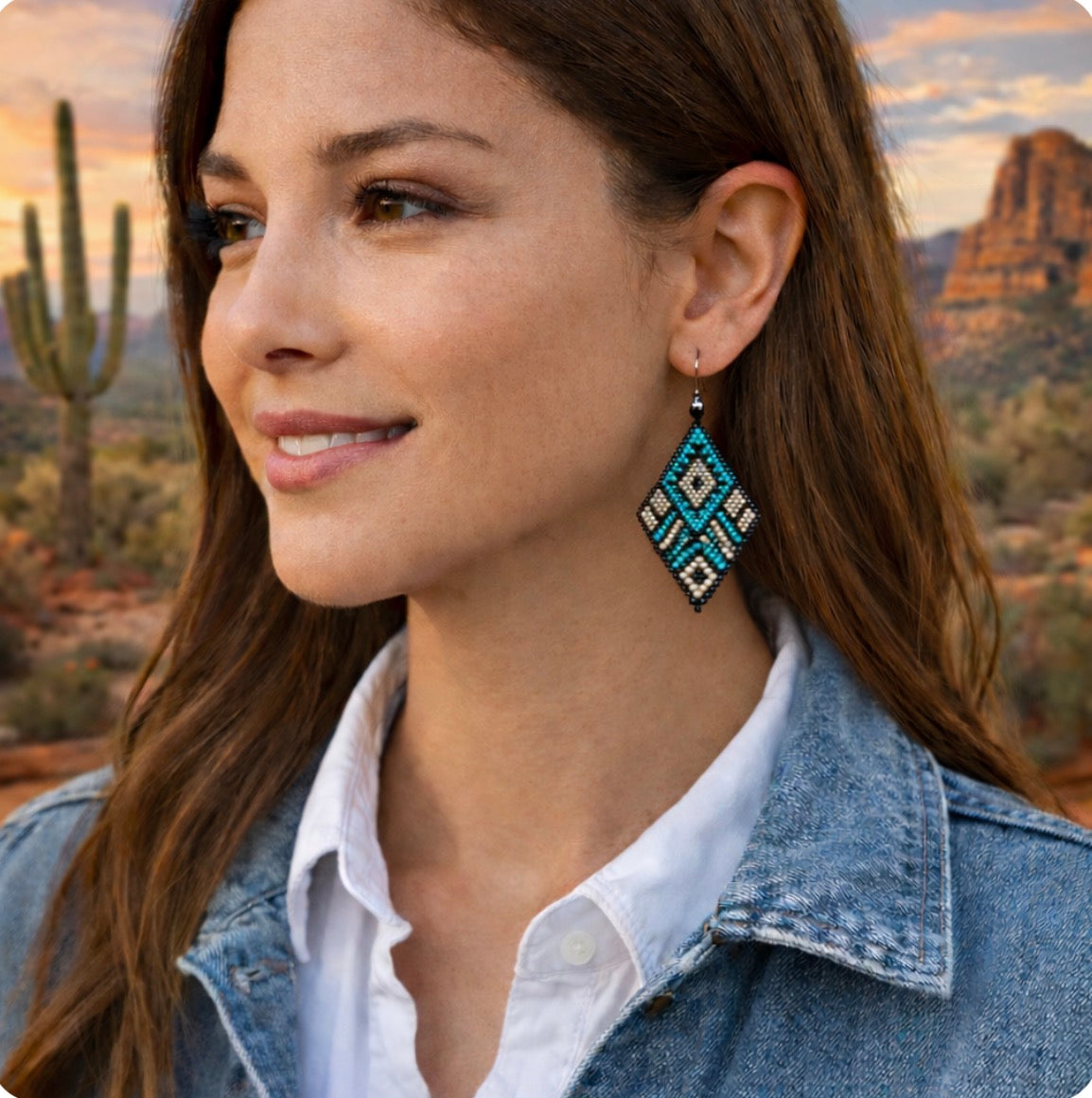 Inspired by my Arizona roots, these earrings feature a classic Southwestern pattern that is close to my heart. Each pair is carefully stitched bead by bead using high-quality glass seed beads in rich turquoise, warm sand, crisp white, and bold black tones to create a striking geometric design.